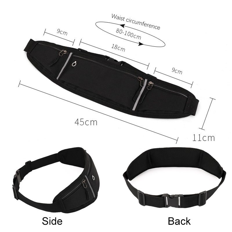 The waist bag with 3-pocket design. The main pocket can easily hold a 6.5-inch phone, and the two side pockets can hold keys, change, etc.