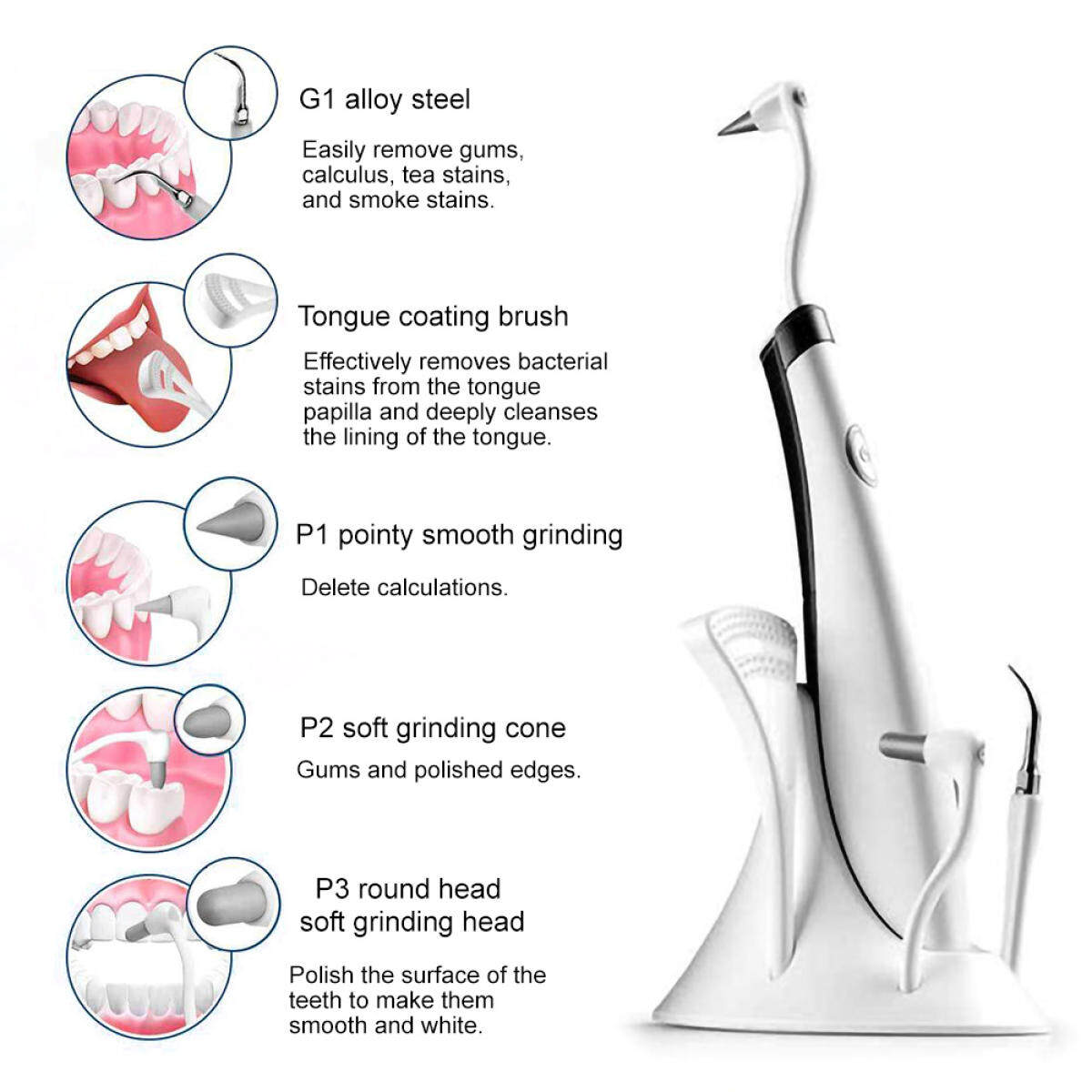Remove dental calculus, teeth stain and smoke stain.