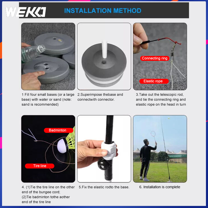 PLAY BADMINTON,NO MORE VENUE RESTRICTIONS:Angle adjustable,Indoor and outdoor universal;FULL CARBON TRAINING RACKET:Lightweight design, not easy to deform and good elasticity;TELESCOPIC ELASTIC ROD:Curvature against racket strike force,The rod body is uniformly stressed and has better toughness;ANTI-LOCK GROOVE DESIGN:Pearlescent paint, beautiful and outstanding ,Disperse the force area and the rod is not easy to get stuck;40 HIGH-STRENGTH ELASTIC ROPES:Upgraded latex elastic line, strong extension,The elastic line can be cut freely and the height of the shuttlecock can be adjusted freely;THREE-LAYER WATER INJECTION BASE:Three-layer mobile water and sand injection base,Easy to carry and ready to use.