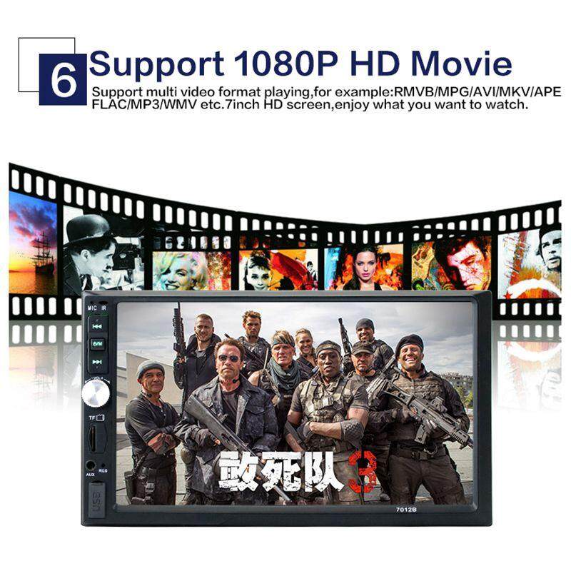 Features: Color: Black Model: 7012B 3rd Material: Plastic + Metal Screen type: TFT Screen size: 7 inch Resolution: 800x480 Power supply voltage: DC 12V Horn impedance: 4 ohms Maximum power: 50W x 4 Volume control: ±8 dB (bass 100HZ, treble 10KHZ) Function: Bluetooth, charger, MP3 players, radio tuner, touch screen, rear view 7'' HD TFT display screen With rear view function Support SD card, U disk play Any state of power failure memory function Built-in Bluetooth function, can match the smart phone Built-in radio AM / FM tuner, automatic search platform function Supports playback of AVI / JPEG / WMA / MP3 / format programs EQ sound control, stereo, left channel, right channel selection/Andriod /IOS Mirror Link Package : 1 x 7012B 3rd Car Radio Player 1 x Remote Controller 1 x Cables Kit 1 x Manual Note: This machine is 12V machine, not according to the 24V power supply