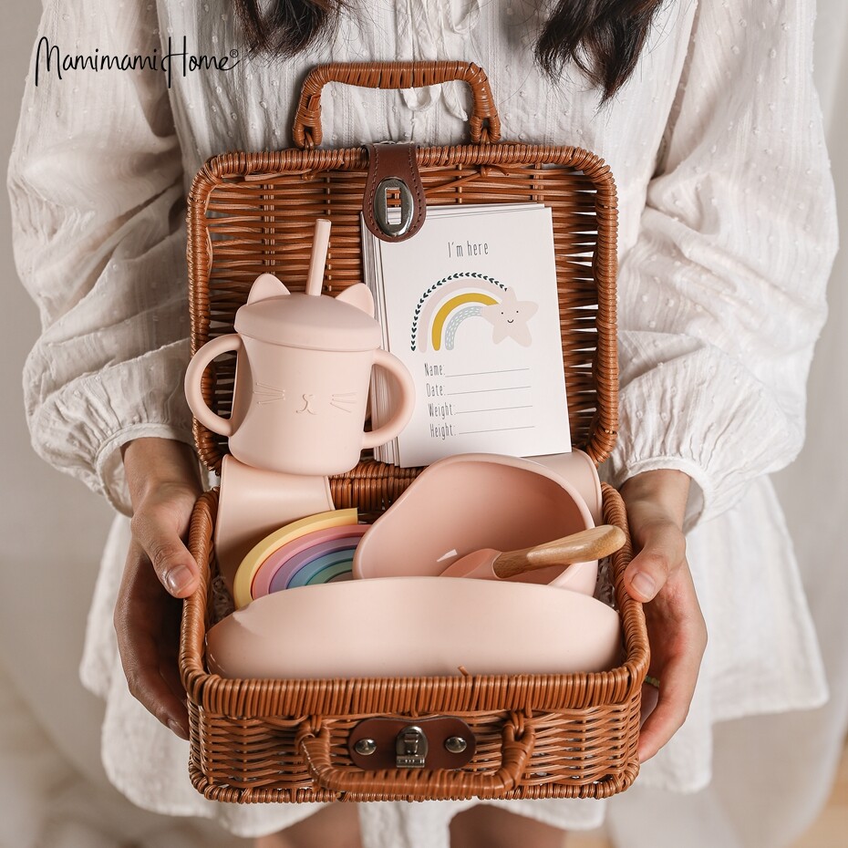 Mamimami Home Baby Meal Feeding Set 100% Silicone Bowl,Sippy Cup,Bib Natural Rattle Toy Toddler Gift with Rattan Box
