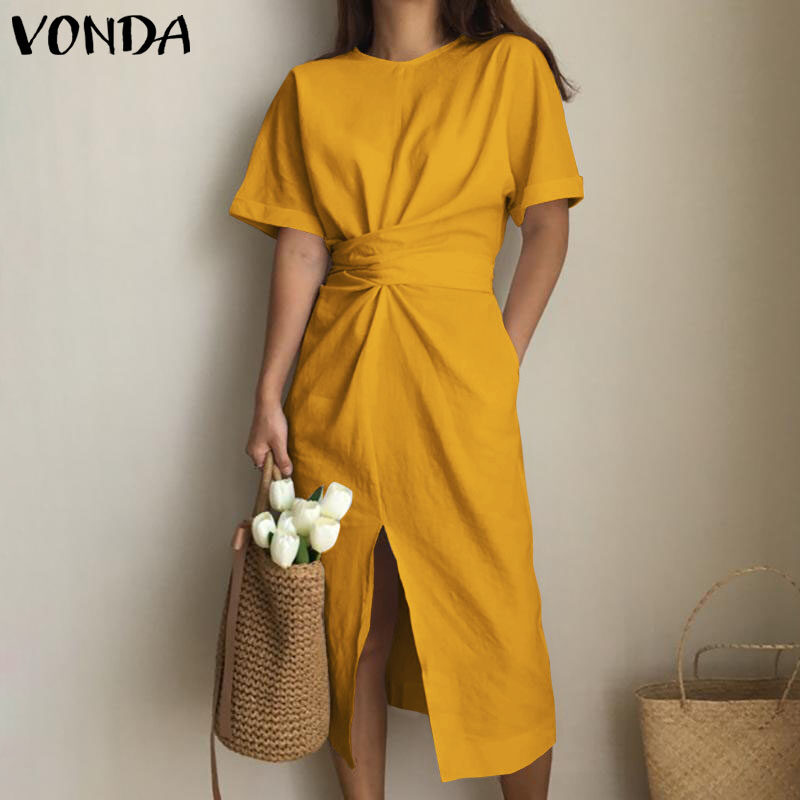 VONDA Women Summer Oversized Short Sleeve Casual Sundress Shirt Slit Dress (Korean Causal)