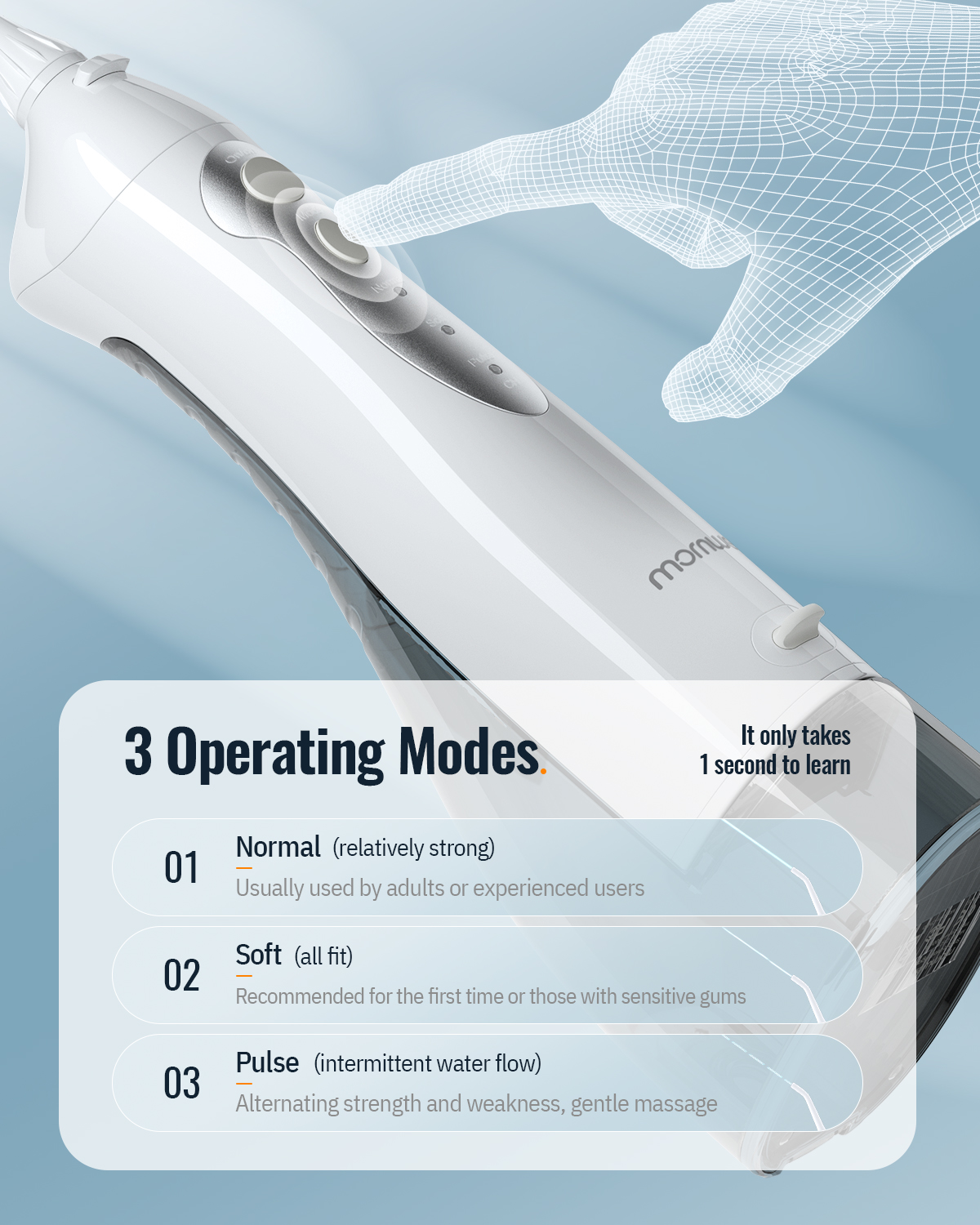 【3 Clean Modes with Memory Function】The cordless water flosser has Normal, Soft, and Pulse modes to meet various oral care needs, deeply clean every corner precisely, remove food debris, prevent bad breath, dental calculus, dental plaque, and gingival bleeding. Memory Function helps keep on with your preferable mode for next use.