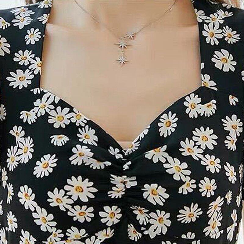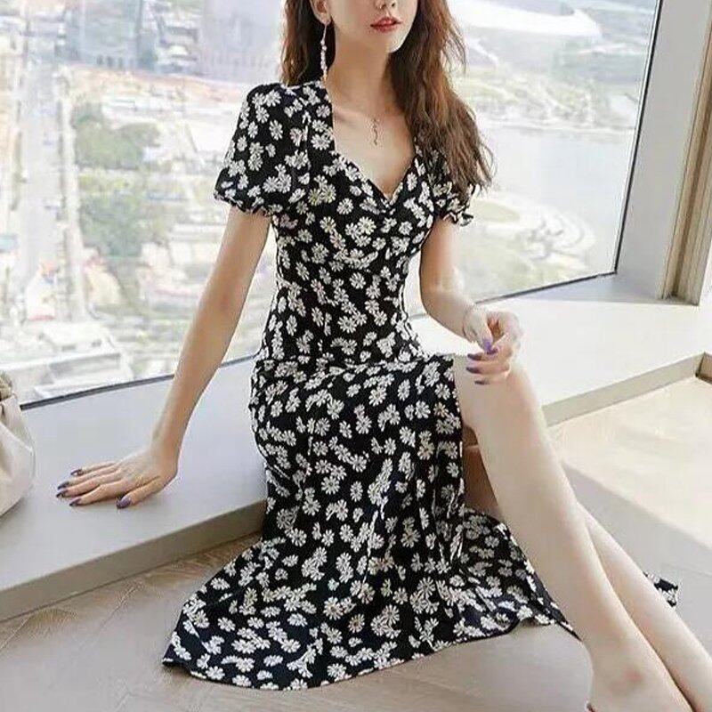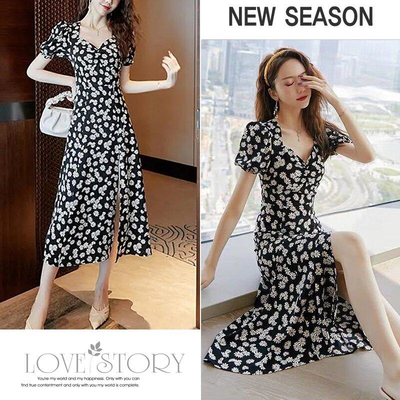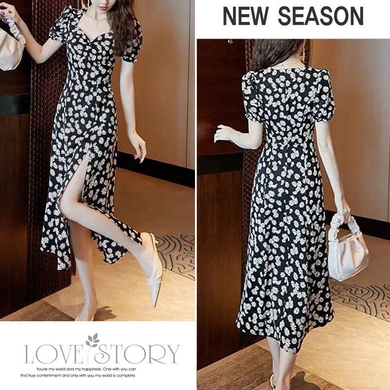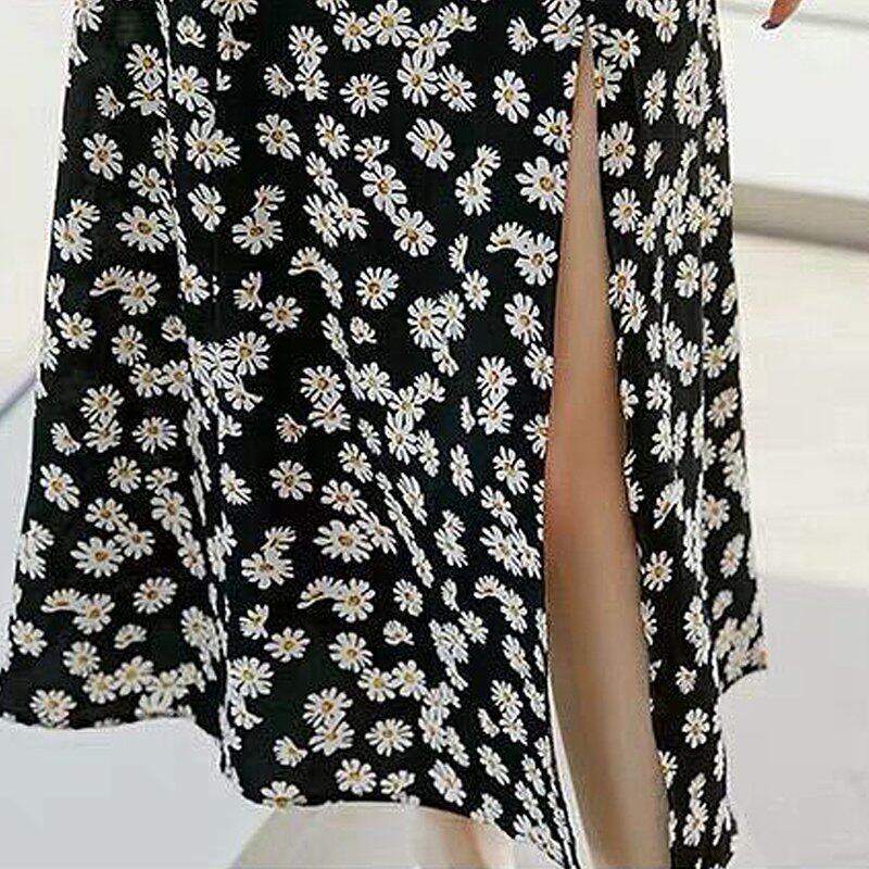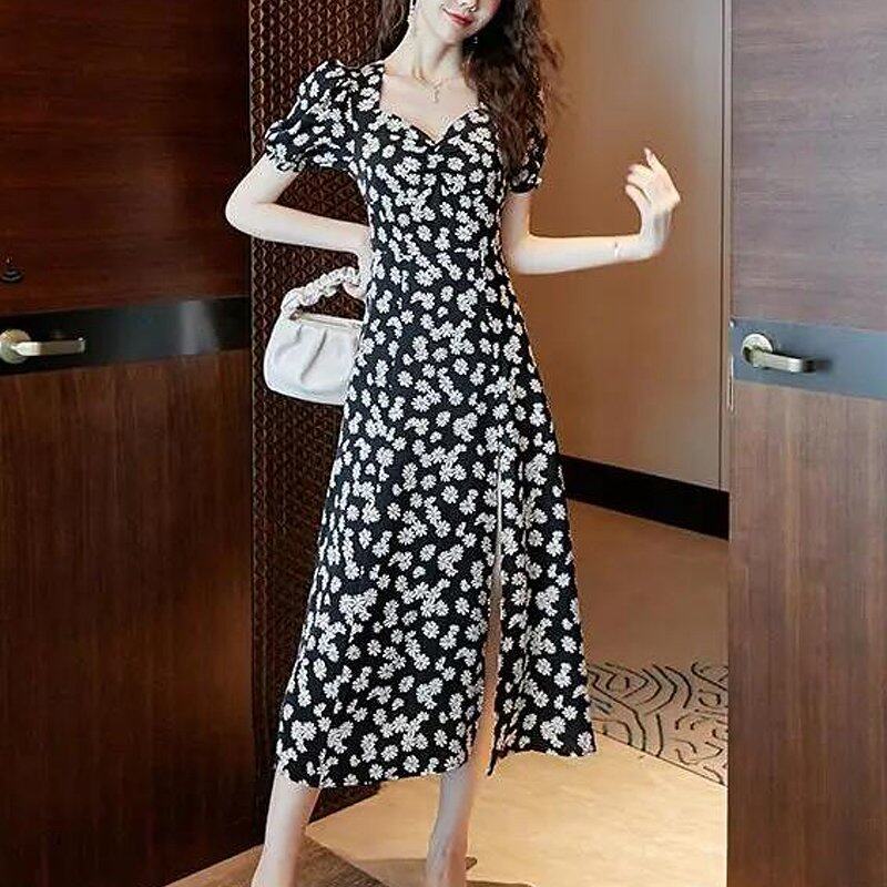 INWPLLR Women's Dress Fashion Bubble Sleeve Dresses Small Daisy Dress Female Korean Style Casual Square Collar Dress New Summer Print Split Dress