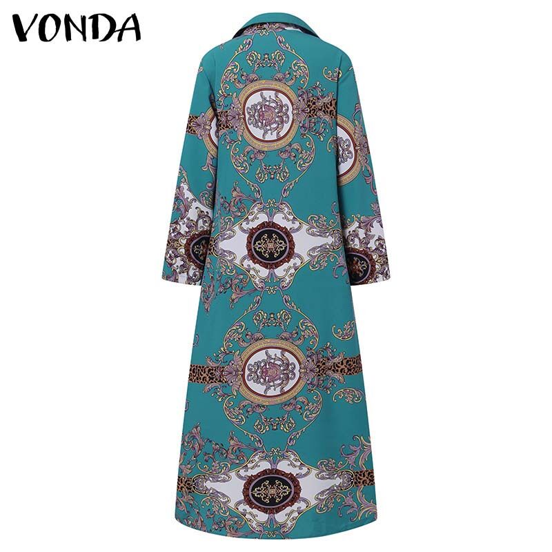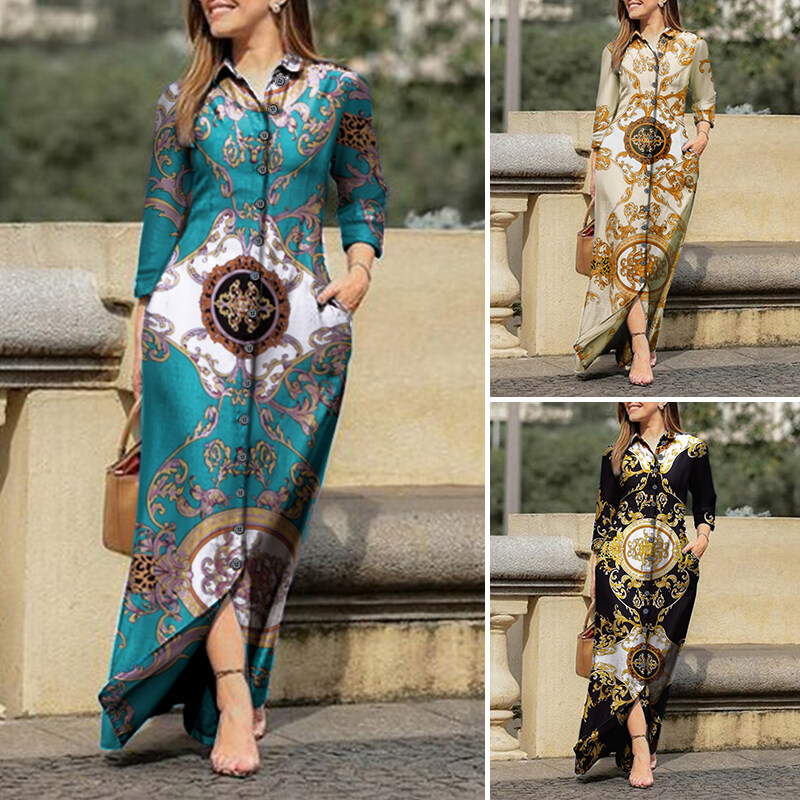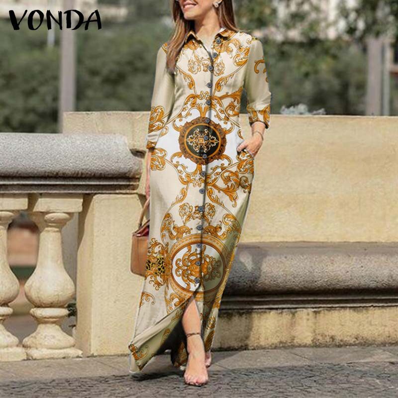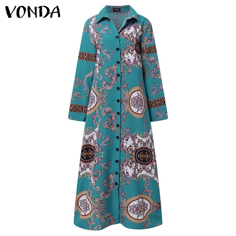 VONDA Womens Vintage Printed Shirt Dress Long Sleeve Floral Tunic Dress T-Shirt Dress (Western Causal)