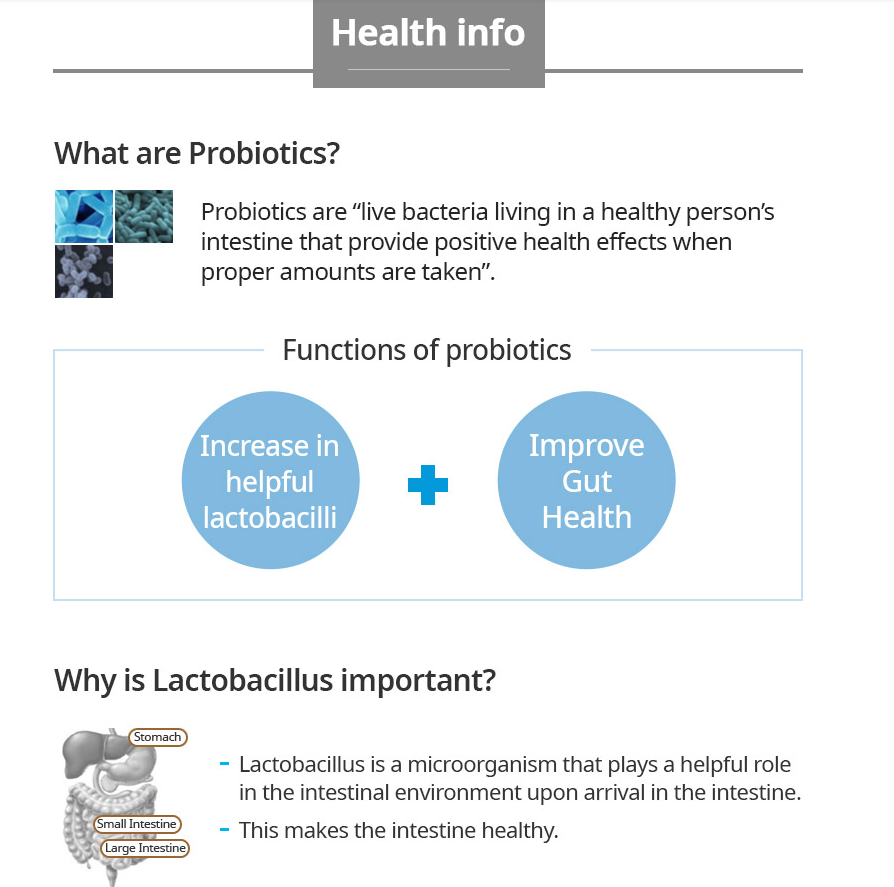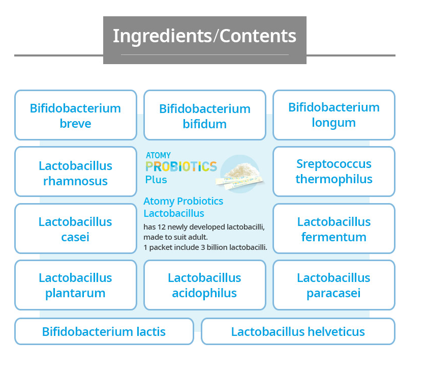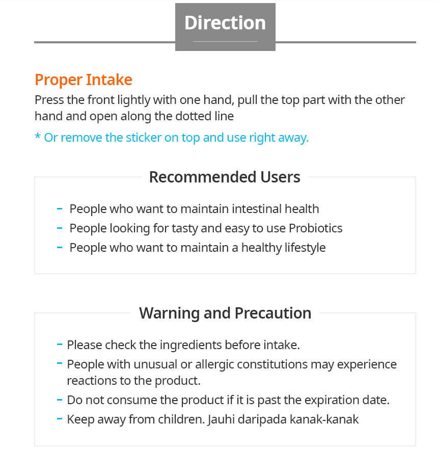 Once a day, take it with water. You can just eat it. Description 12 types of mixed Lactobailli make your stomach happy. Increases helpful Lactobacilli, restrains growth of harmful bacteria and help with bowel movement. Recommend Users: