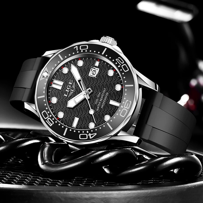 LIGE Sport Diver Watches For Men Stainless Steel Waterproof Date Clocks Men Watch Military Quartz Watch + Box