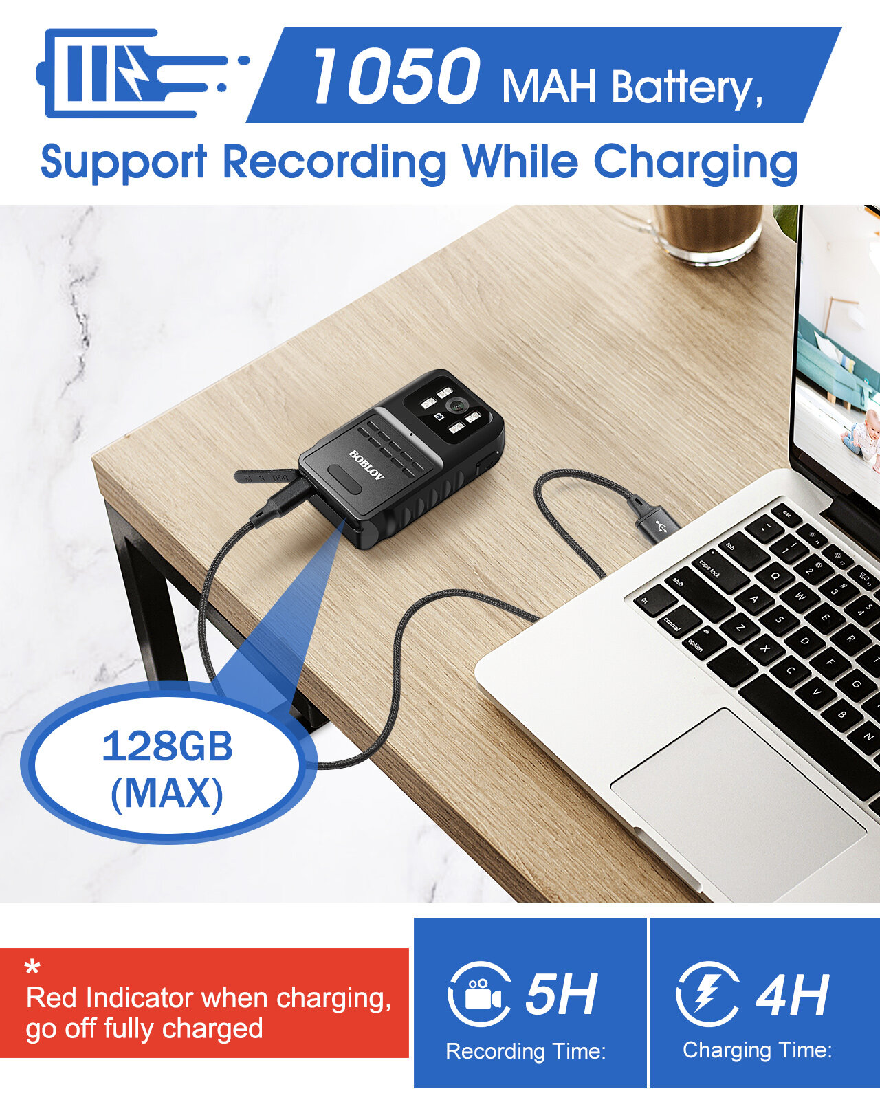 • Built-in 1050 MAH battery, recorder supports about 5 hours recording(WiFi&IR Off) and use when charging.