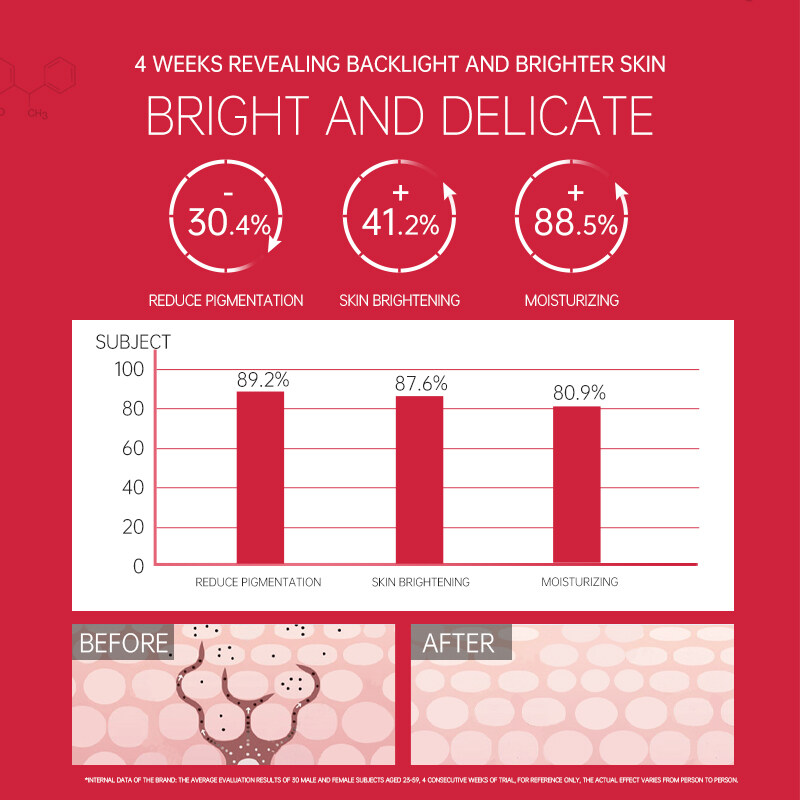 Product composition:Water, caprylic/Capric triglyceride, 1, 3-propylene glycol, butanediol, C14-22 alcohol, C12-20 alkyl Glucoside, Glucose, α -arbutin, Glycerin, Cetyl alcohol, polydimethylsiloxane, 1, 2-pentanediol, PEG-100 stearate, Glycerol stearate, hydrogenated ethylhexyl olivinic acid, hydrogenated olive oil unsaponifiable, phenylethyl malechol, polyglycerol-10 stearate, nicotinamide, 3-o-ethyl ascorbic acid, propylene glycol, glycyrtinic acid, lecithin, tocopheryl acetate, Coconut oil glucoside, isononyl isononate, PHYLLACANTHA FIBROSA extract, BLETILLA STRIATA stem extract, CHONDRUS CRISPUS extract, phenoxyethanol, methyl hydroxybenzoate, SALIX ALBA bark extract, MORUSALBA. Leaf extract, biological sugar gum -1, polyamino acid polysaccharide condensation, BUTYROSPERMUM PARKII fruit fat, acrylic (ester) copolymer sodium, lecithin, hydroxyethyl acrylate/propylene Sodium dimethyl taurine copolymer, Squalane, polysorbate-60, Sorbitan isostearate, MAGNOLIA SIEBOLDII extract, PAEONIA ALBIFLORA Root extract, 1, 2-hexadiol, p-hydroxyacetophenone, Myrrh, Lactobacillus/soybean milk fermentation product filtrate, Xanthan gum, Sodium dihydrogen phosphate, GLYCYRRHIZA GLABRA root extract, EDTA disodium, butylhydroxytoluene, Sodium hyaluronate, disodium hydrogen phosphate, (daily) essence