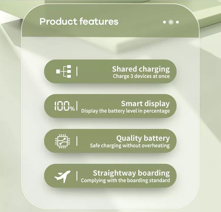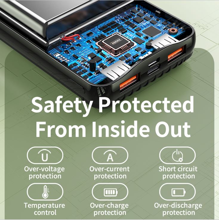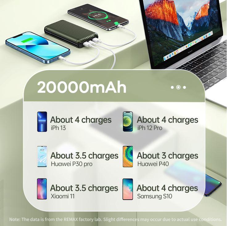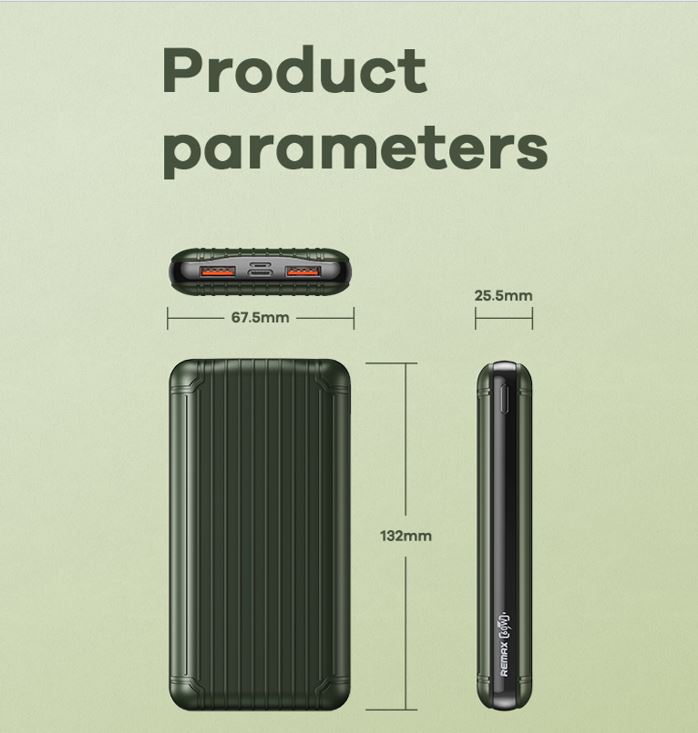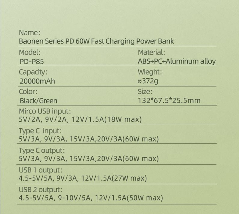Brand REMAX Model No.PD-P85 Cell type Polymer lithium ion battery Battery Type Square aluminum shell Colour: Cyber Greeb Power Capacity : 20000 mAh (74Wh) Micro Input : 5V⎓2A / 9V⎓2A / 12V⎓1.5A Type C Input : 5V⎓3A / 9V⎓3A / 15V⎓3A / 20V⎓3A (60W) Max Type C Output : 5V⎓3A / 9V⎓3A / 15V⎓3A / 20V⎓3A (60W) Max USB1Output : 4.5V⎓5A / 5V⎓2A / 9V-10V⎓2A / 12V⎓1.5A (30W) Max USB2 Output : 4.5V⎓5A / 5V⎓2A / 9V-10V⎓5A / 12V⎓1.5A (50W) Max