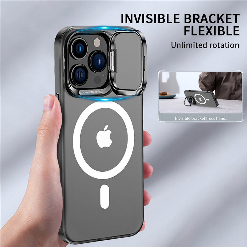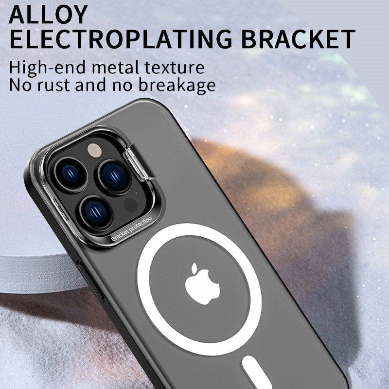 Features : Metal Camera Holder Phone Case + Magnetic Materials :Airbag soft silicone frame + anti-yellowing PC hard backplane Soft and hard combination, more shockproof performance Ultra-thin magnetic phone case is specially designed for iPhone13 / 12 series, compatible with Magsafe, stable charging 38 powerful magnetic cores are built in the magnetic ring, which can be accurately positioned and adsorbed, so it is firm and not easy to fall off Matte hard backboard, surface sprayed with oleophobic coating, anti-fingerprint, anti-stain, anti-sweat The screen and lens are protruding design, anti-scratch