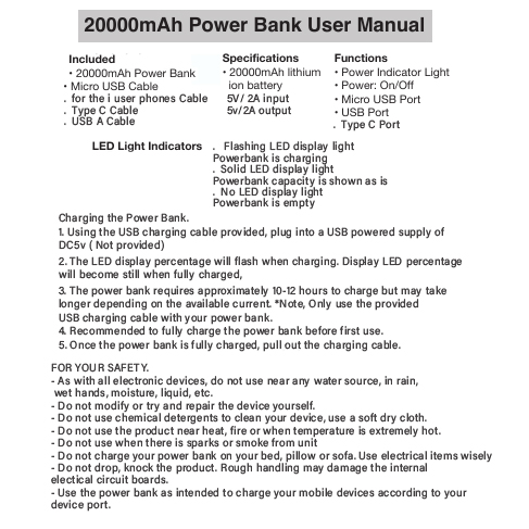c) Do not disassemble, open, microwave, incinerate, paint, or insert foreign objects into the portable power bank.