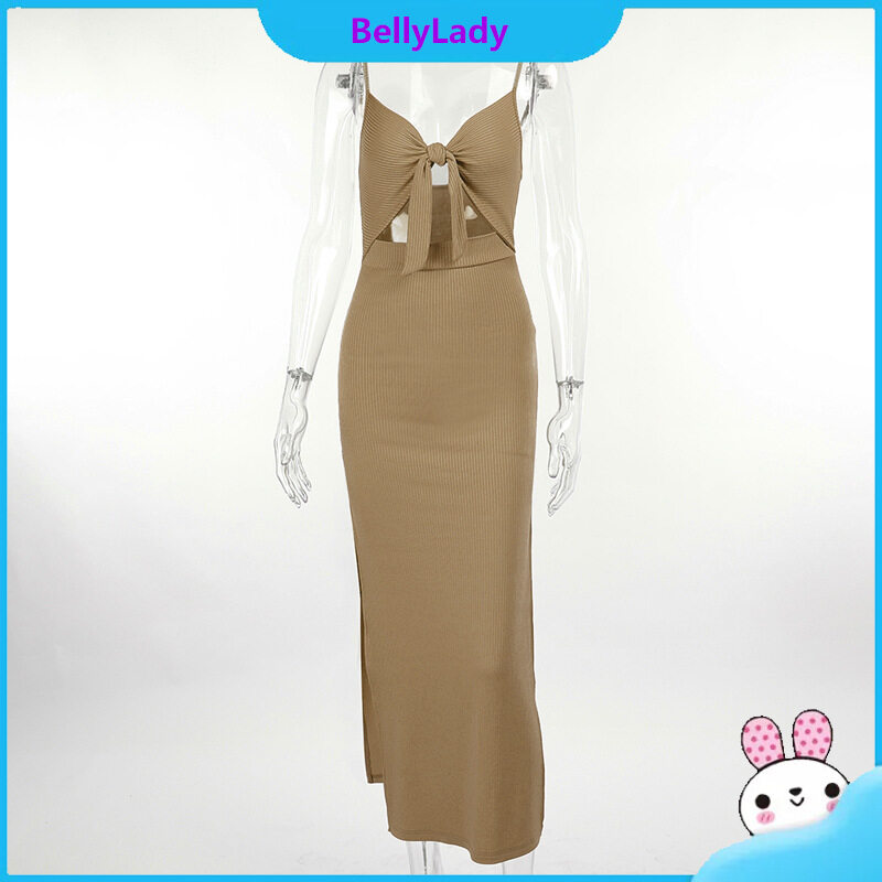 Women Suspender Slim Fit Dress Sexy V-neck Pullover Long Skirt Solid Color Lace-up Hollow Slit Dress