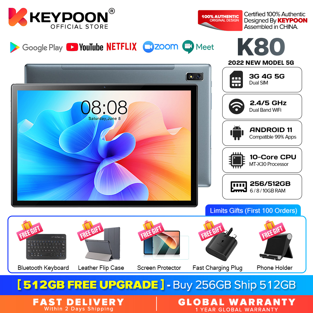 BRAND PROMOTION: 【Buy 256GB Ship 512GB】- Customer just need to order 8GB+256GB variant, then seller will auto ship 10GB+512GB without paying price difference. Limited Quantity Offer 100pcs for sales ONLY!!! WARRANTY: 【1 Year International Warranty】- Comes with KEYPOON Official warranty card. We support 1 year free item warranty, in case the item getting any issue without non-aritificial damages, we can repair and even give 1to1 exchange new item. PRODUCT FEATURE: 【SUPERIOR WATCHING EXPERIENCE】KEYPOON K80 Tablet is powered by 10-Core Processor. 2022 upgraded Android 11 tablet provides + 40% faster processing speed than regular Quad-Core. 10.1-inch Tablet screen size with 1920x1200 resolution support, perfect for home entertainment and office. DUAL-BAND WI-FI】The 2022 KEYPOON K80 Built-in Dual-band wifi module, Support 2.4/5Ghz wifi, the faster wifi you get, the more stable wifi for your smoother watching movie experience. 【DUAL-SIM】The 2022 KEYPOON K80 Tablet support dual SIM feature, support 3G/4G/5G netowrk, and also support phone call feature. All-in-One Tablet that make your life experience be more easier and convenient. 【BIGGER THAN BIGGER】The tablet has 8GB RAM, 256GB/512GB internal storage. The GMS Certified latest Android Tablet, with basic Google apps already on and without bloatware. Get rid of unexpected ads and download apps from Google Play, such as SKYGO, NetFlix, YouTube and more. 【LONG LASTING BATTERY】Equipped with a long-lasting and environmentally compliant 8800 mAh battery, this 10-inch tablet will effortlessly provide you with up to 8 hours of support for reading, browsing, watching movies and playing games. The long-lasting battery life and lightweight design allow you to enjoy your tablet anywhere, anytime. 【DUAL CAMERAS AND SPEAKERS】With front 5 MP & Rear 13 MP dual cameras, which would bring your excellent photos and clear video chats. Dual speakers are designed to provide high-quality and powerful sound for your favorite music, games and videos. SPECIFICATIONS: Model: KEYPOON K80 (2022) CPU: X30 10-Core System: Android 11 (System Upgradable) Screen Size: 10.1 Inches IPS Screen Screen Resolution: 1920 * 1200 WiFi: Dual Band 2.4G/5Ghz WiFi Bluetooth: BT 4.0 Battery: 8800mAh Li-on Battery Camera: Front 5MP + Rear 13MP Speaker: Dual Stereo Speaker RAM: 6GB/8GB/10GB ROM: 128GB/256GB/512GB Cellular: 3G/4G/5G DUAL SIM Charging Port: Type C WHAT'S IN THE BOX: 1 * Tablet PC 1 * User Manual 1 * Type C Cable 1 * SIM Card Pin 1 * Official Warranty Card SPECIAL FREE FITS: 1 * Leather Flip Case (Limited Gifts) 1 * Bluetooth Keyboard (Limited Gifts) 1 * Tempered Glass Screen Protector (Limited Gifts) 1 * OTG Converter (Limited Gifts)