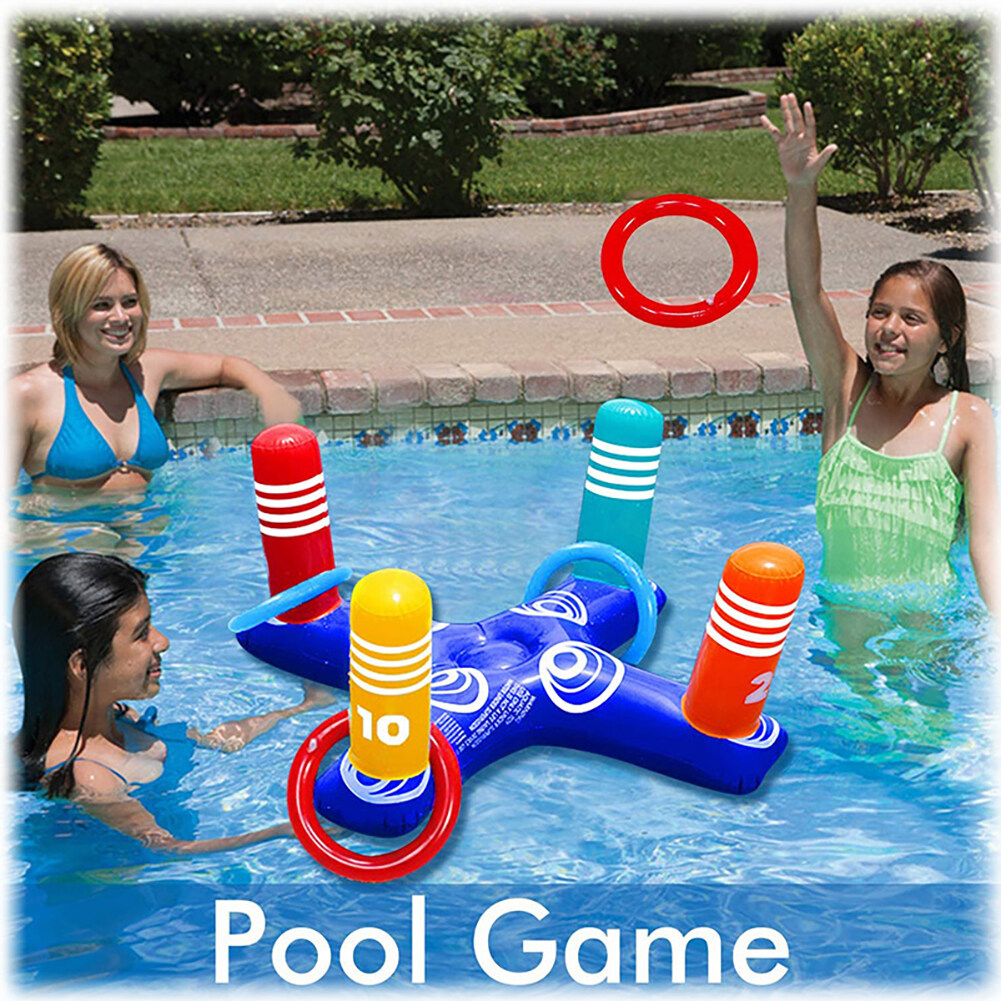 1. Pool Tossing Game: Set includes 1 Inflatable Pool Tossing Game, 4 Tossing Rings and 1 Pump. 6 pieces of inflatable billiards game for multiplayer.