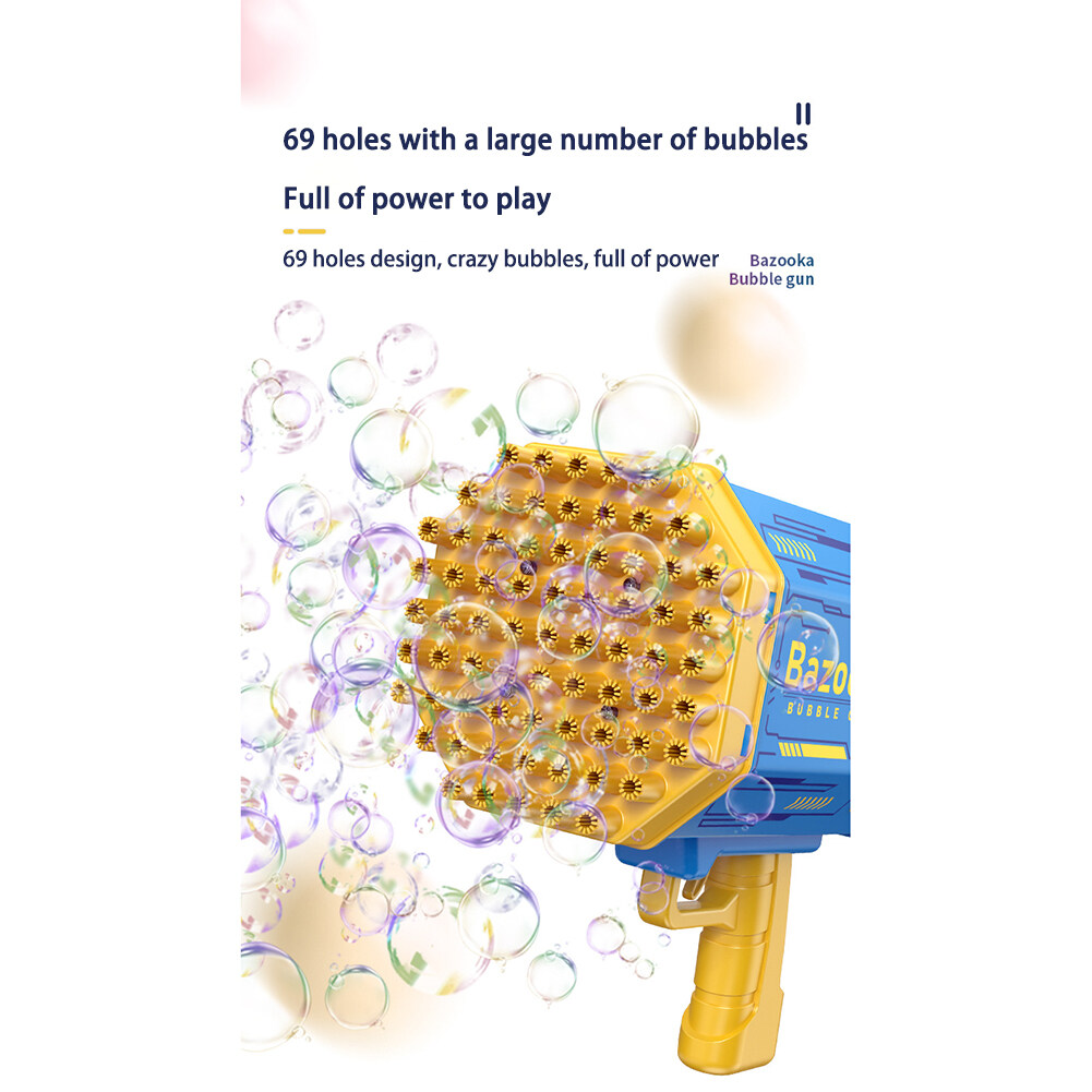 Features:--Abundant Accessories: Bubble Machine x 1, Bubble Liquid x 2, Battery x1, Charger x1, Tray x 1. Easy to clean and won't stick to your hands.--New Upgraded 69 Holes Design: The bubble machine has 69 bubble holes and can blow 2000+ colorful bubbles per minute. It is equipped with four colorful lights, which bring you amazing effects, no matter day or night, press the button, you can see the rich colorful bubbles being blown out, the fantastic lights render colorful bubbles, you can play in the Enjoy colorful scenes at night.--Most Popular Rocket Bubble Machine: Bubble machine is very popular among parents, kids and their followers. As a must-have tool for dates, birthday parties, stages, weddings, Christmas and more. It's the perfect prop for photos.--High-quality anti-drop material: The bubble machine is made of high-quality ABS material, with rechargeable battery, environmentally friendly, durable, safe to use, no sharp edges, thickened shell and anti-drop, so children can play with more peace of mind, very Perfect for kids to play and entertain as well as grown-up.--Eco-friendly material: Bubble machine made of ABS plastic material, safe, durable, lightweight and leak-free. Meets American toy standards. Security tested. Comes with a rechargeable 2200mAh battery, the foam is sustainable and eco-friendly! Remove the bubble head and turn it into a small fan, bringing cool and comfortable wind.--Ideal Gift: The Bubble Machine is an ideal gift for kids on any occasion. Such as bubble themed parties, entertainment, camping trips, beaches, birthday parties, carnivals, weddings, baby showers, halloween, BBQ, Christmas and many more.