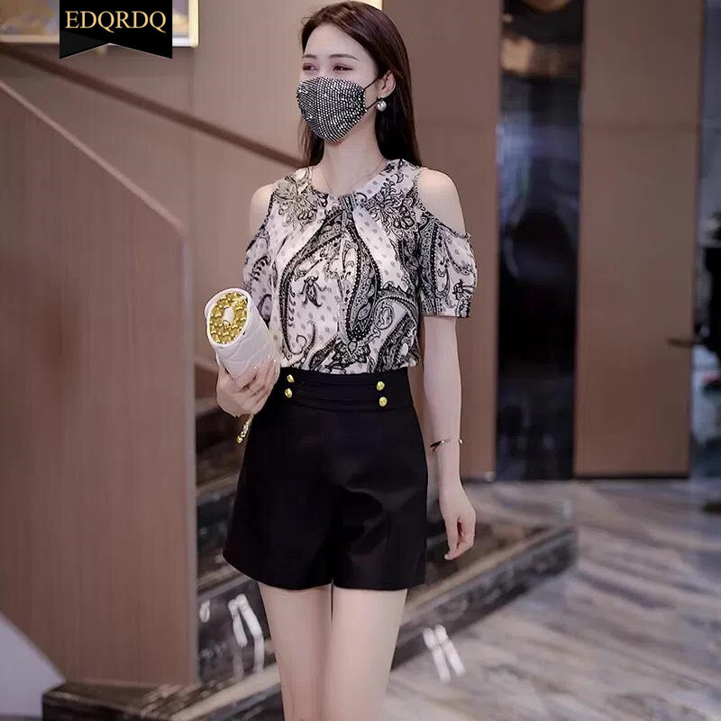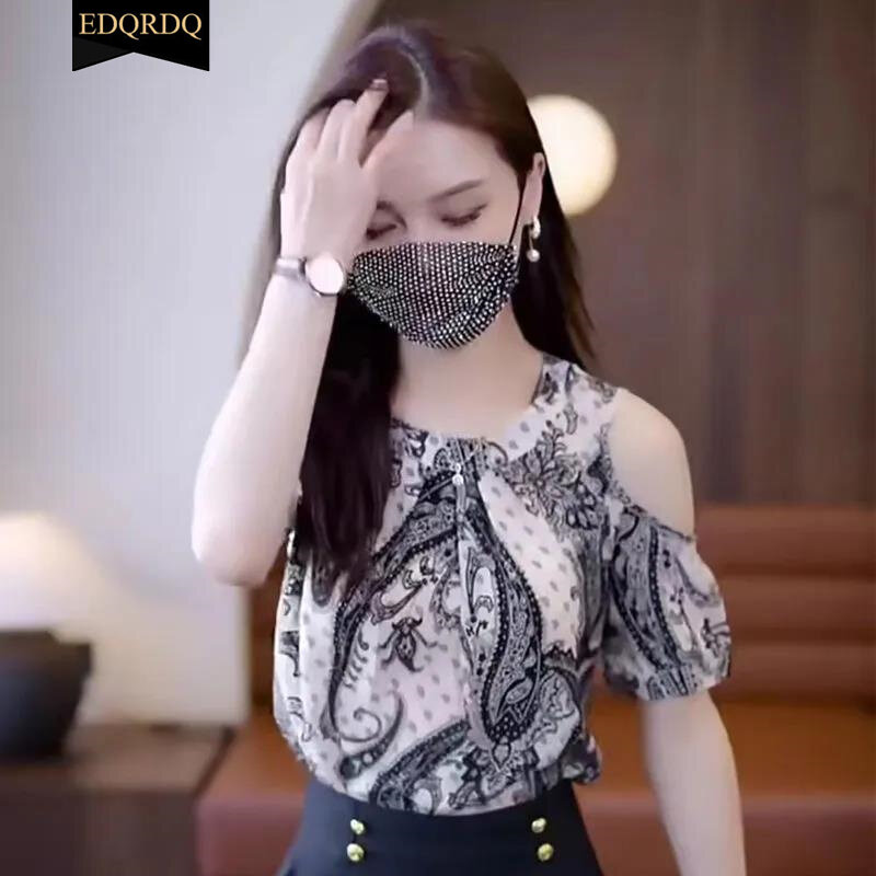EDQRDQ Women's Cold Shoulder Summer Shirts O Neck Tops Short Sleeve Floral Flowy Chiffon Shirts