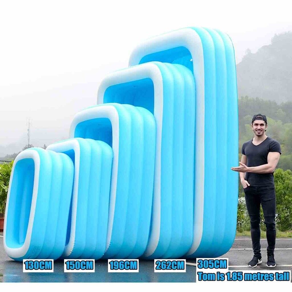 Product description:This product is suitable for new born and above, it is made off eco-friendly material.This product is adjustable, the user is able to adjust the height freely.This pool is design with safety valve so that it can be easy to inflate and deflate.The thickness matching for this swimming pool is the same as the thickness.After water is fill into it, the shape of the swimming pool will remain unchanged.This swimming pool is tough and durable, it is also cannot cut by a real knife.It is also built with three big valve so that user can adjust the height of the swimming pool by themselves.The fall point built on the bottom of the swimming pool can easily release water out of the swimming pool.Three layer design of this product is to prevent it from break and leakage.The water line inside the swimming pool have a top water line so that user can estimate the water level they want.Product features:External dimensions:- (L)150x(W) 110X (H)50cm (3kg)- (L)210 x (W)140 x (h) 65cm (5kg)- (L)262x(W)175x(H)60cm (6kg)- (L)305x(W)183x(H)60cm (8.2kg)-Multi purposes-showering, swimming, playing.-Eco friendly material-Thick, durable, & comfortable-Easy to carry & Store-Multi layer structure and valves-Material: eco-friendly PVCHow to play:-Guide your baby/kids to showering, swimming or playing inside this swimming pool-Firstly, use the electric pump to inflate the swimming pool.-User can adjust the height of the swimming pool when inflated according to their children height.-After user finish playing or swimming with their children, simply open the fall hole built below the swimming pool to easily send the water out of the swimming pool.Recommended for baby/kids. Adult supervision is need:** Suitable for how many people?1)(L)150x(W) 110X (H)50cm : 2-3 people2)(L) 210X (W)140x(H)65cm : 3-5 people3)(L) 260X (W) 170X (H)61cm : 5 -7 people4)(L)305x(W)180x(H)60cm : 7 - 8 people* Note:1. there will be 5-8cm differ due to manually measurement.2. color will be slightly differ due to different monitors or mobile screen showed.Parcel included:1PCs X swimming pool1PCs x electric pump (if selected pump)