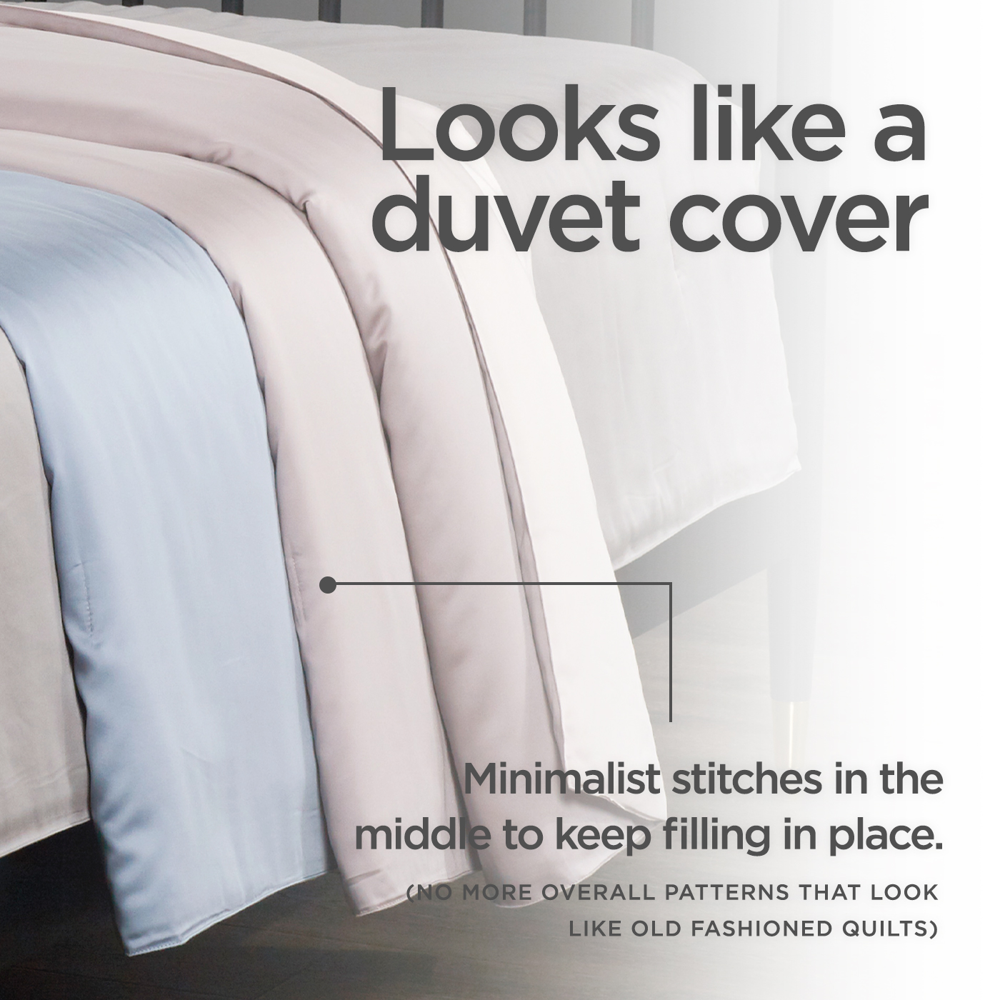 We have designed our light quilt to look exactly like a duvet cover when laid on your bed. To keep the filling in place, we created small stitches across the quilt to ensure a minimalist look for the light quilt. Unlike many other summer quilts on the market with old-fashioned large overall patterns, our minimalist stitches are technically more advanced to produce.