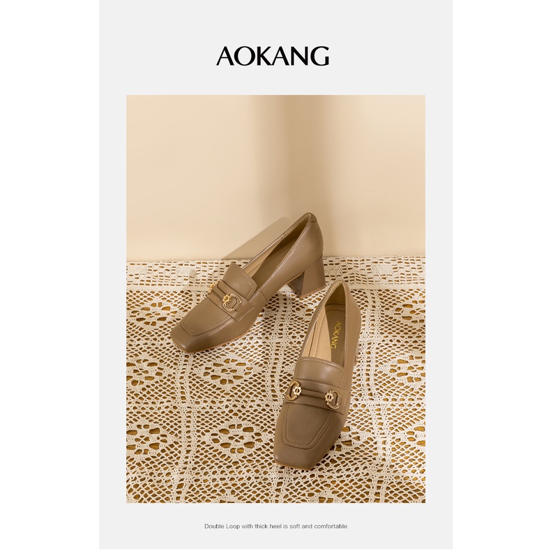 AOKANG Women's Shoes 2022 Autumn New Style Genuine Leather Formal Wear Thick-Soled Square Root Commuter Office