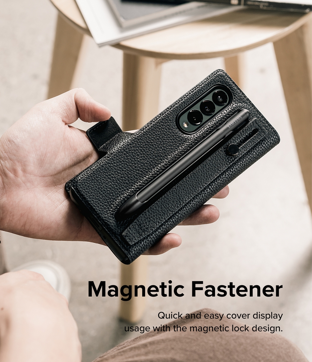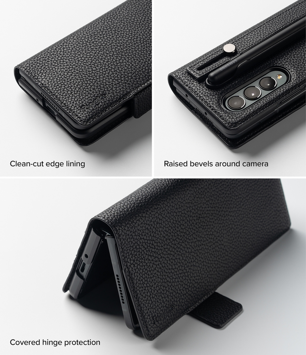 - Artisan-crafted, all-around coverage folio-type case for the Galaxy Z Fold 4 with a comfy built-in hand strap and stick-on S Pen holder