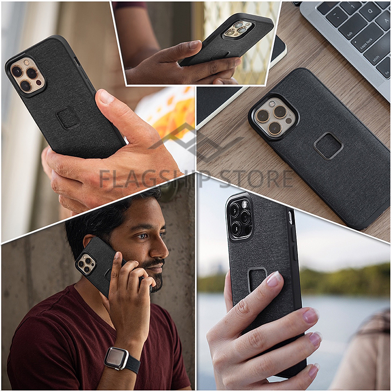 A phone case with the perfect balance of slimness, smart aesthetics, and protection, plus it brilliantly connects to the entire Peak Design Mobile Ecosystem. It's like a tuxedo for your phone—a tuxedo with a slim 2.4mm profile and protective rubberized bumper, all wrapped in beautiful nylon canvas shell. But what truly sets the Everyday Case apart is the brilliant magnetic/mechanical lock that's built right into it. We call this mounting technology SlimLink™, and it's so fast and secure that it borders on magic. With this case on your phone, you can instantly connect to all Peak Design Mobile mounts, chargers, and accessories. It even works with Apple MagSafe accessories, too.