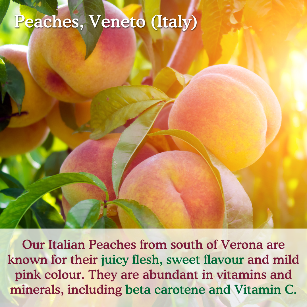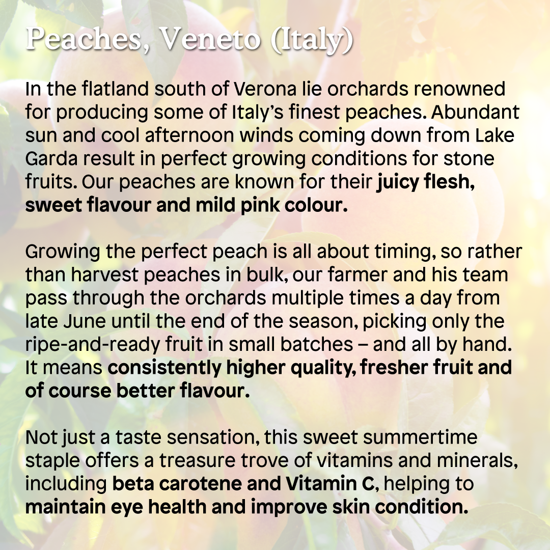 The abundant sunshine and cool winds coming down from Lake Garda means the orchards south of Verona are renowned for producing some of Italy's finest peaches. Our peaches are harvested by hand (never by machine) ensuring only the ripest and juiciest peaches are picked.