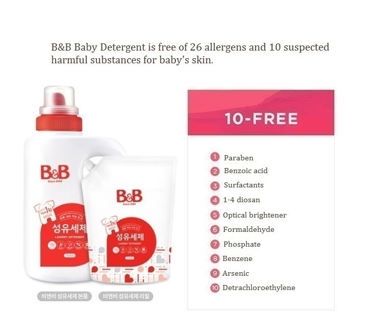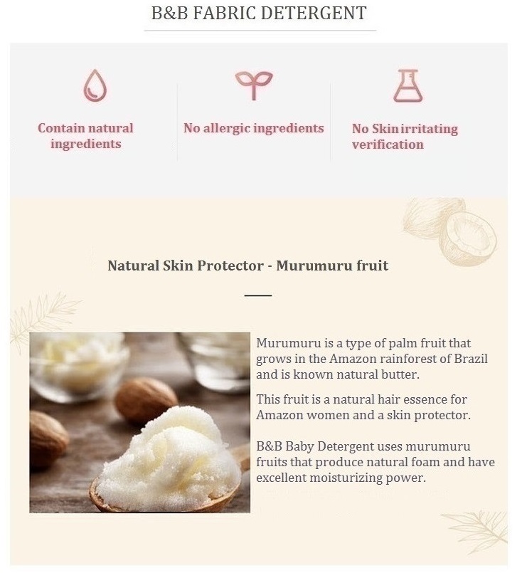 B&B'shypoallergenic and chemical-free baby detergent helps protect your baby'sdelicate skin against skin irritation and rashes with the gentle and effectiveformula. Contains Murumuru fruit grown in Amazon, which cleanses baby fabricnaturally. Our hypoallergenic formulation is topped off with natural herbscent, which comforts the mind and body through aroma therapy.