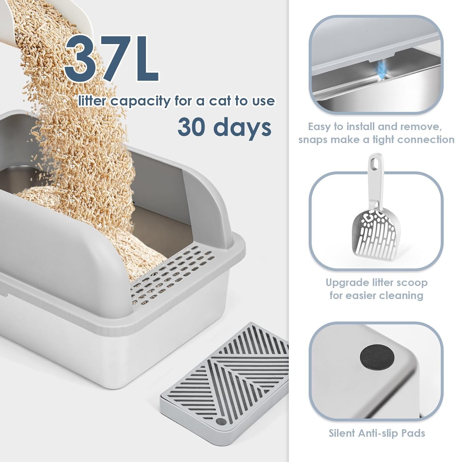 • Doesn't Absorb Odor - Cleaning the high walled stainless steel litter box for cats is very easy as waste slides off the smooth and nonstick surface effortlessly, leaving no lingering odors behind. Sturdy stainless steel won't get rust and scratches where odor can harbor like the plastic litter box does, creating a clean and hygienic environment for your cats.