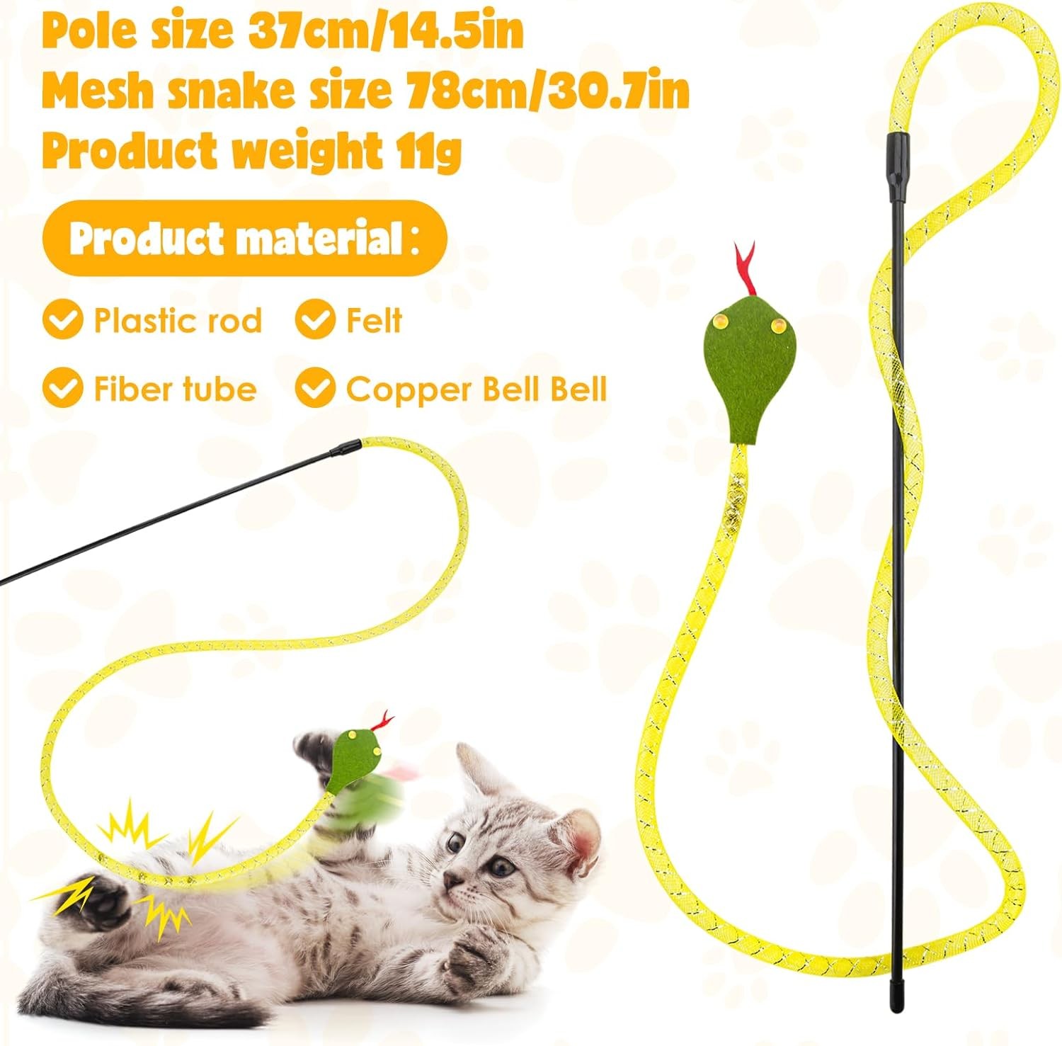 • Double the Fun:Snake toy is sure to keep your cat’s attention. Includes a Plush Snake with crinkle paper and a Mesh Snake with bells, providing diverse entertainment for your feline friend.
