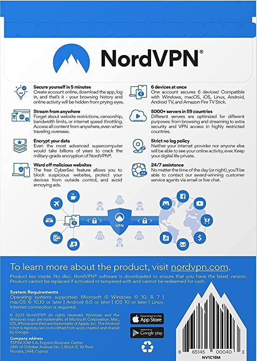 • This is a combination of 2 physical products: NordVPN 1-Year & 18-Monh Subscriptions. Both of these products will be delivered to you physically. Compatible with Windows, macOS, Linux, iOS, Android, and other platforms.